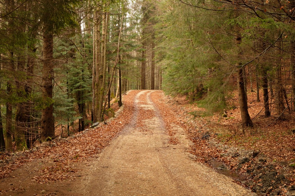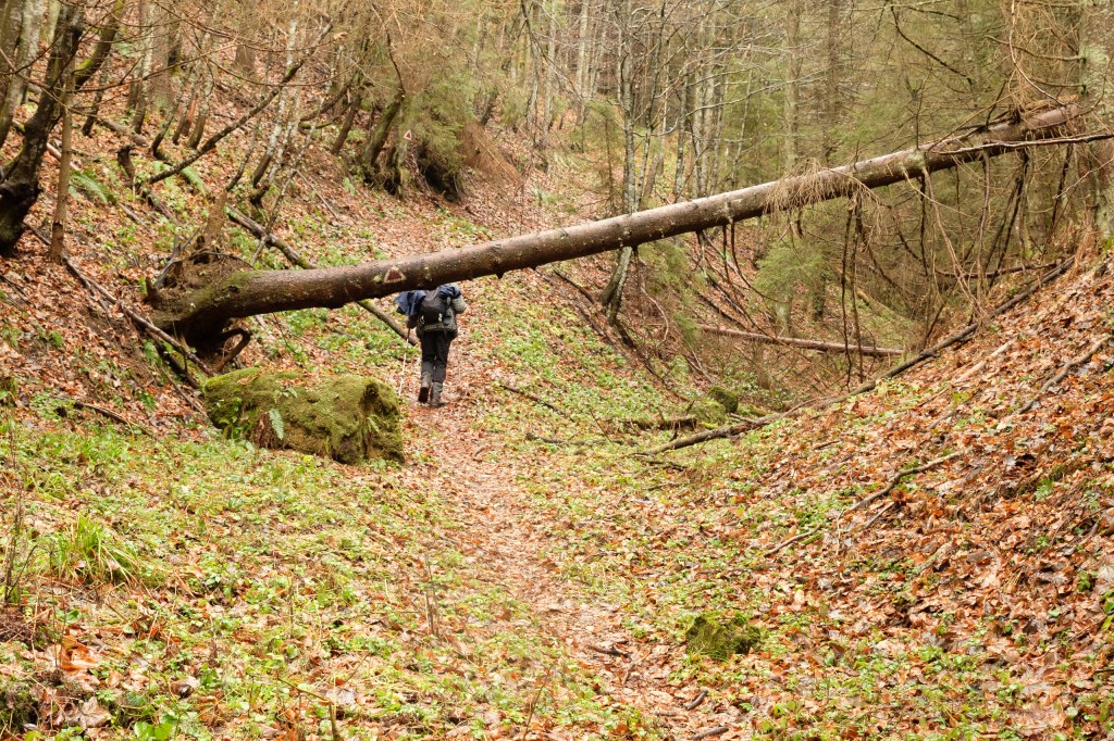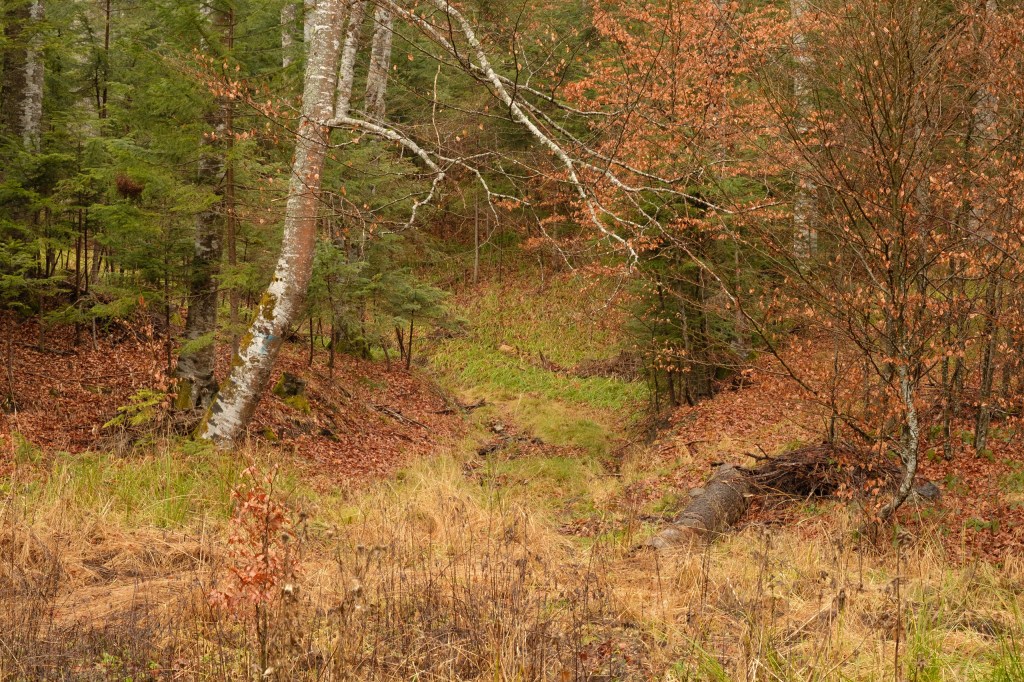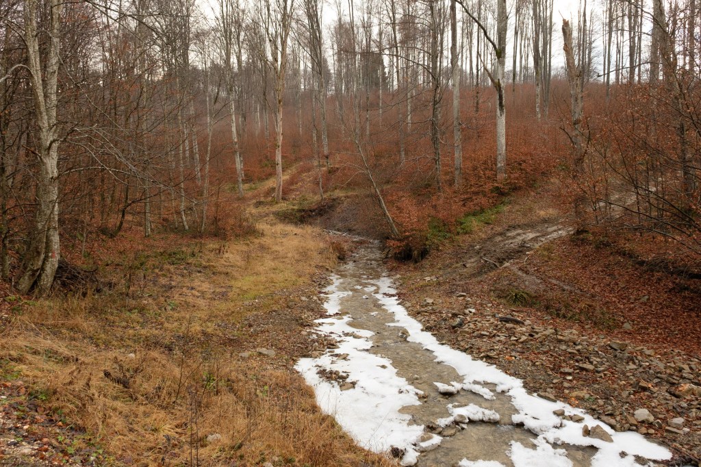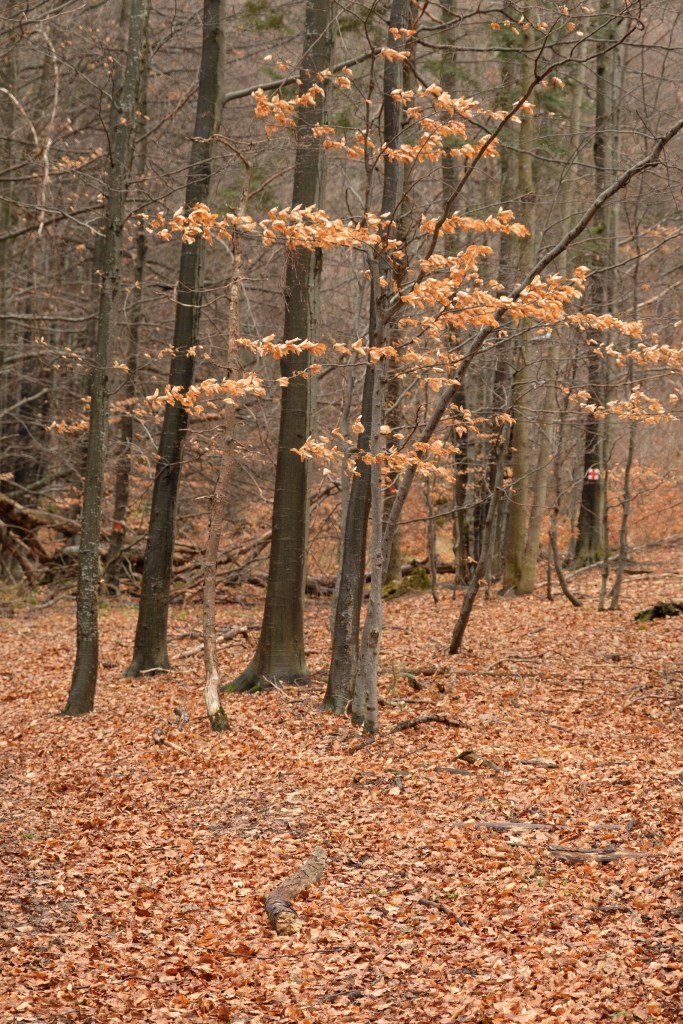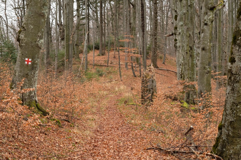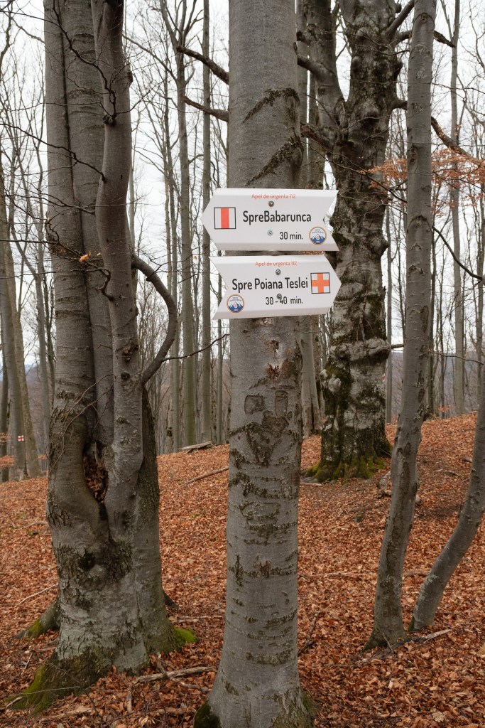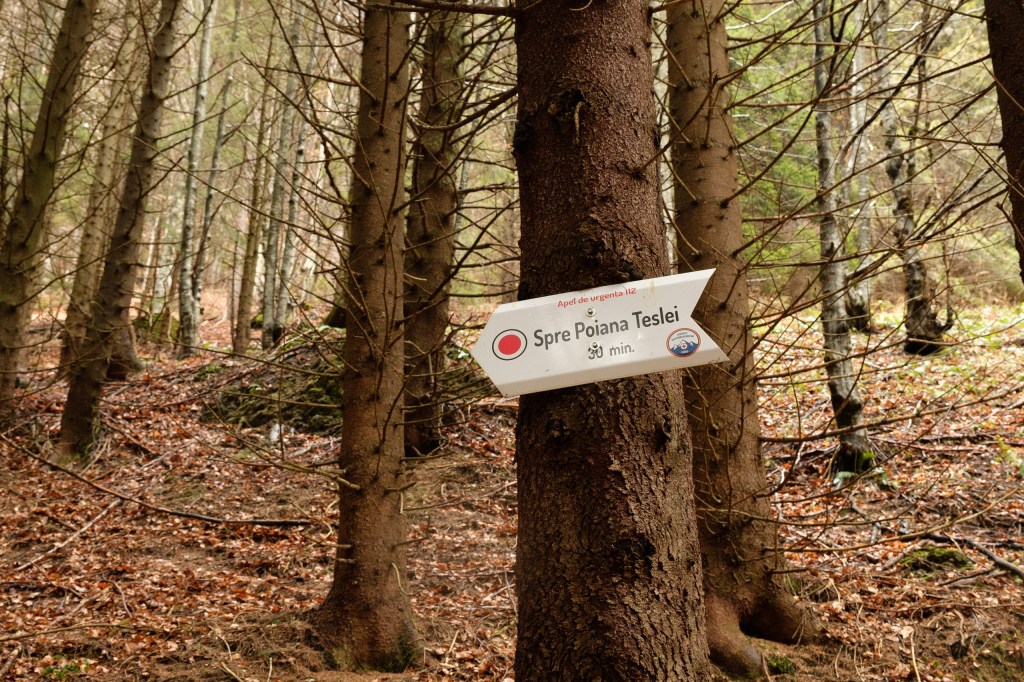 Din Poiana Tesla traseul coboara pe o coama pana la Podul Teslei, aflat pe DN1A. Pe poteca era un covor proaspat de jir (fructul fagului), semn care anunta o iarna mai blanda, cel putin asa zice vorba din popor.