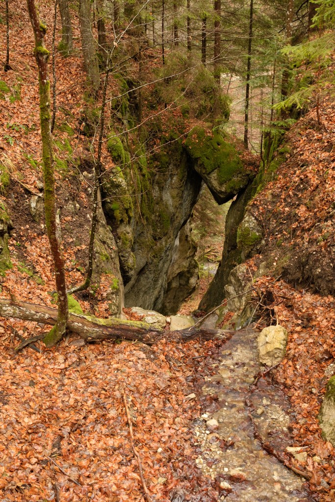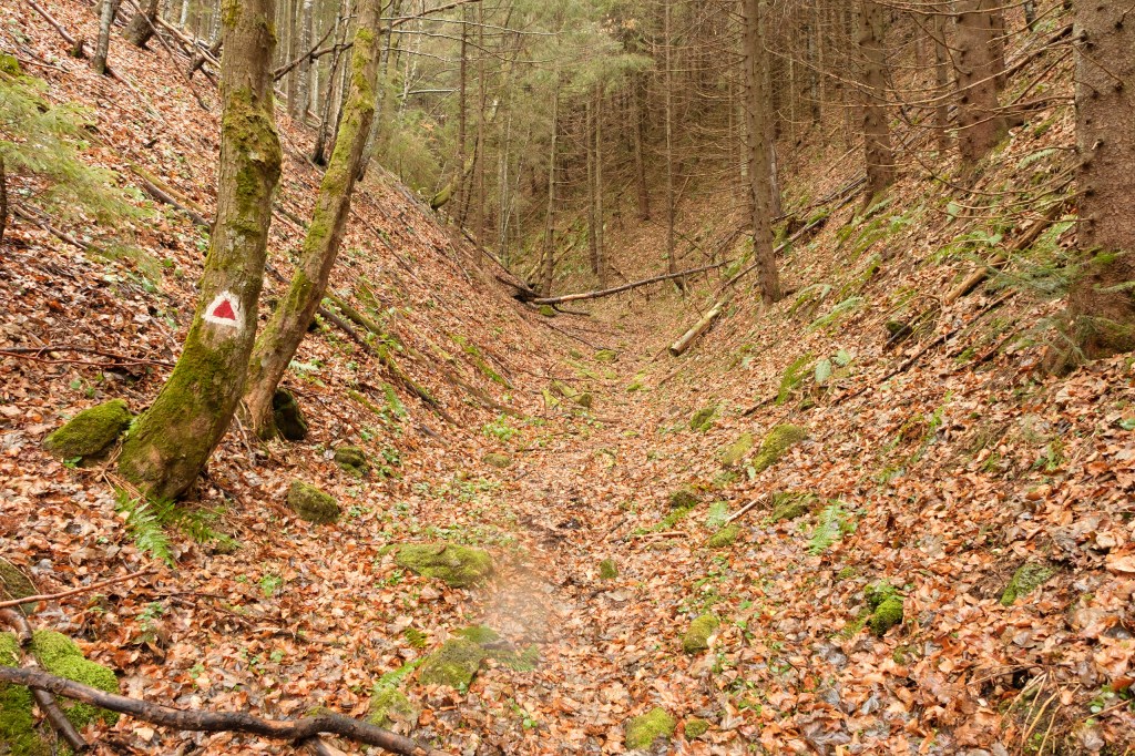 La capatul drumului forestier am ajuns intr-o zona mlastinoasa, in care se aduna mai multe izvoare ce formeaza paraul mai sus mentionat. De aici traseul continua pe o vale intunecoasa, ingusta si abrupta, pana in Saua Tesla. Tot de aici marcajul incepe sa fie mai precar si mai rar insa poteca e bine definita si nu ai cum sa gresesti drumul.