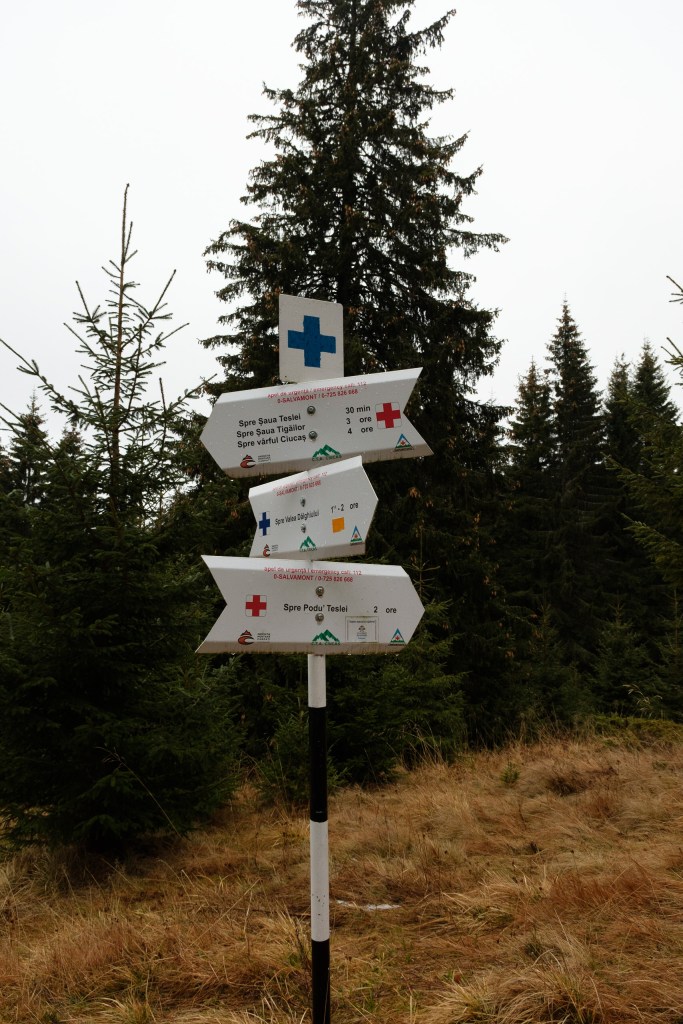 Din Saua Tesla fac stanga, spre Poiana Tesla: in dreapta traseul continua spre Saua Tigailor. Poteca se mai niveleaza si mai urca putin doar in Poiana Tesla.
