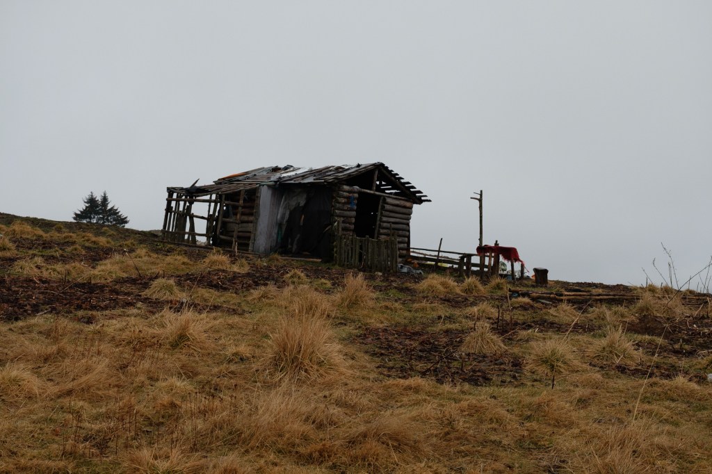 Poiana Tesla m-a primit cu ceva vant si cu un plafon de nori foarte jos astfel ca Vf. Tesla abia se distingea. Am mancat pe fuga, la „umbra” unui brad, si apoi am cercetat stana din poiana. Era cam darapanata fata de ce imi aduceam eu aminte cand intr-o primavara am mancat, adapostiti de vant, in interioul ei.