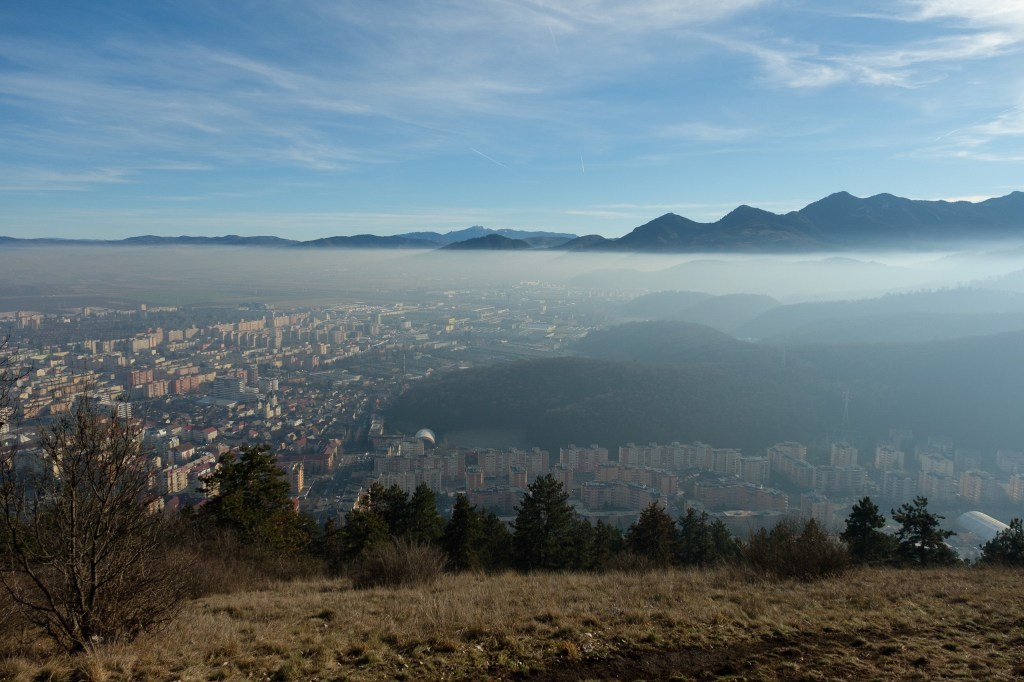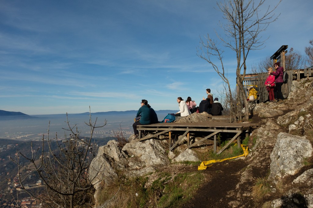 Dupa o urcare solicitanta, pe banda galbena, am ajuns intr-o poienita dotata cu masa si bancute si asezata strategic la umbra unui copac. De aici poti admira o bucata din Brasov, acoperita cu ceva nor de aceasta data, semn al inversiunii termice resimtite de altfel.