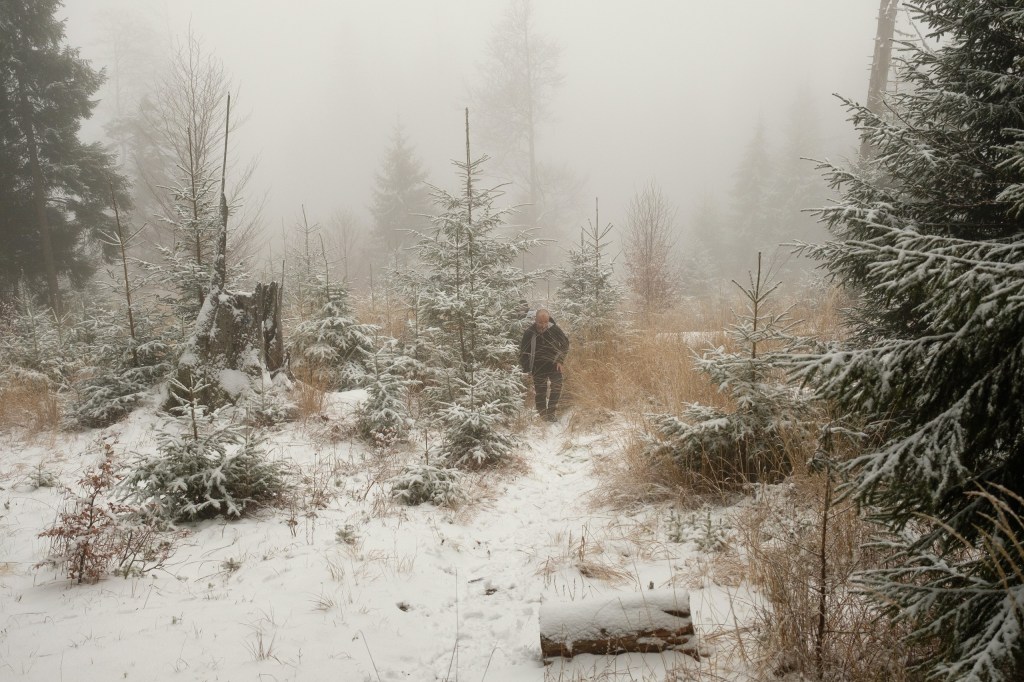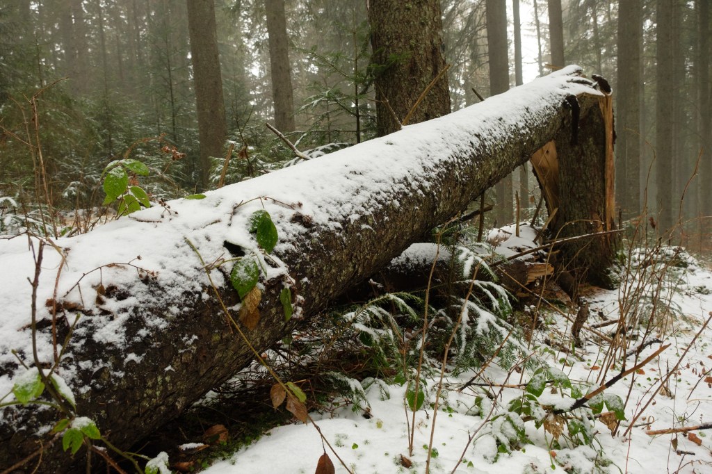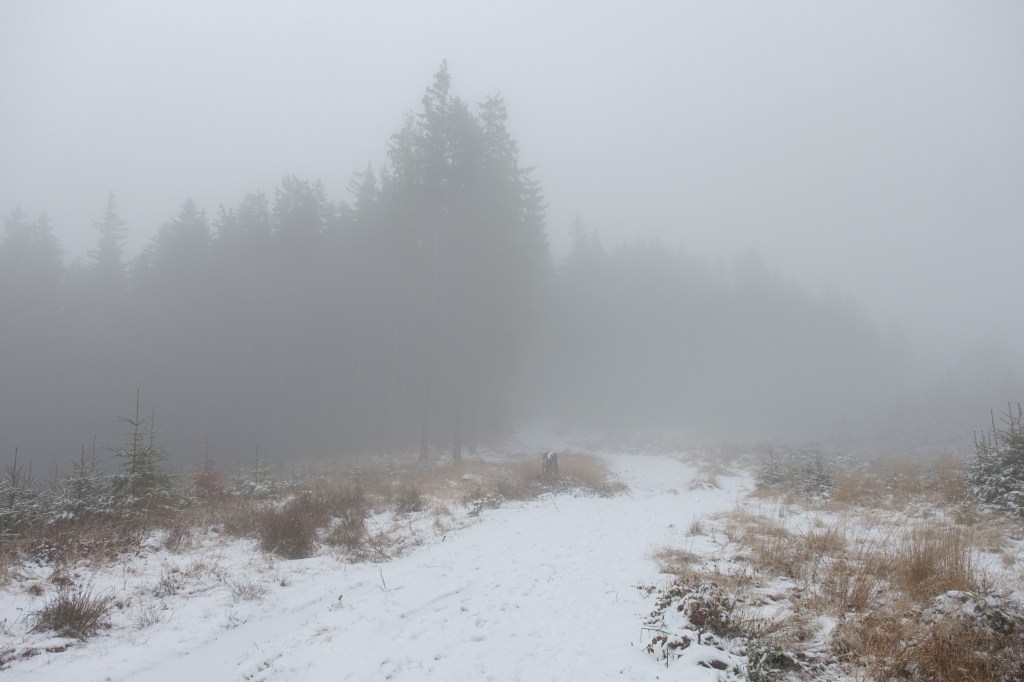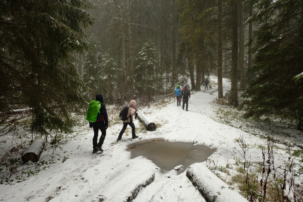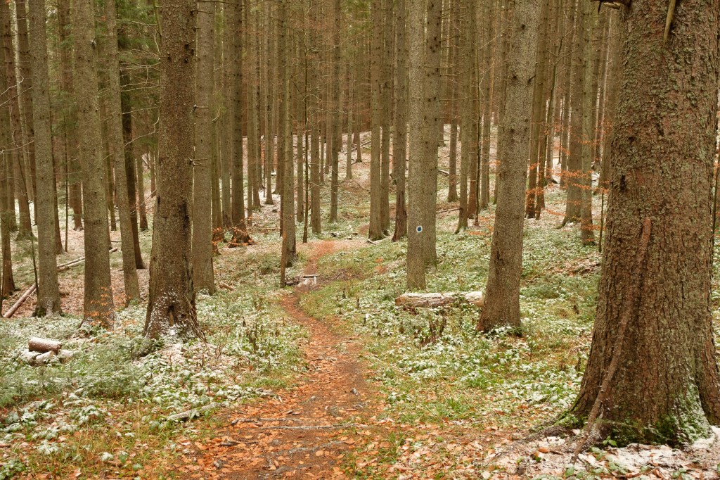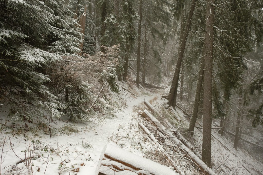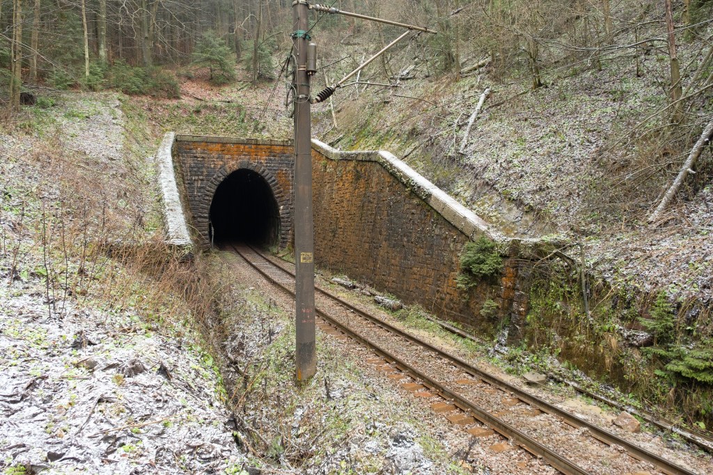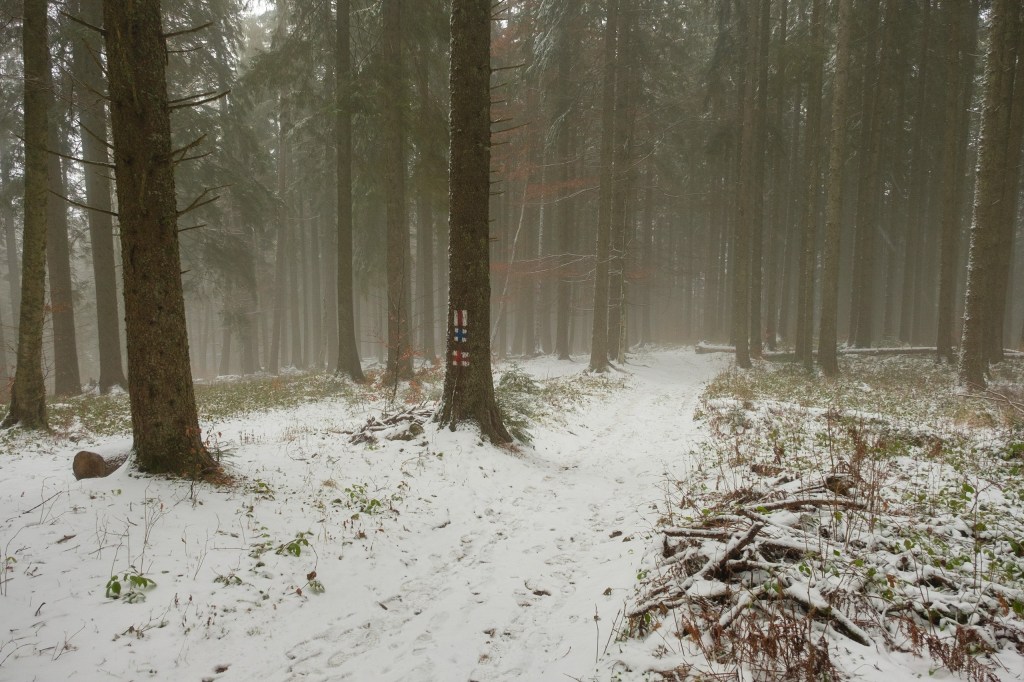 Am inceput traseul pe o ninsoare pe cinste. La scurt timp traseul cu bulina albastra se desparte, spre stanga, de cel cu banda/cruce rosie. Astfel incepem sa coboram spre tunelul de cale ferata printr-o padure de molid si fag. Traseul nu este practic din acest punct de vedere, ca incepe cu o coborare, dar eram curios sa vad cum e. La tunel avesti sansa vedeti si trenul iesind din tunel.