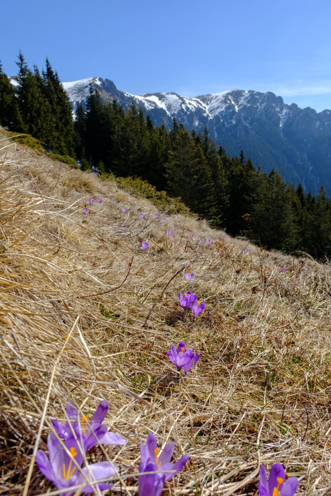 Urcarea de la Muntele Rosu spre Gropsoare nu iti da timp sa te incalzesti, incepe direct, drept in sus. Am avut noroc cu pajistile pline de ghiocei si branduse care sa ne domoleasca elanul si sa mai facem cate o pauza pentru o poza, doua.