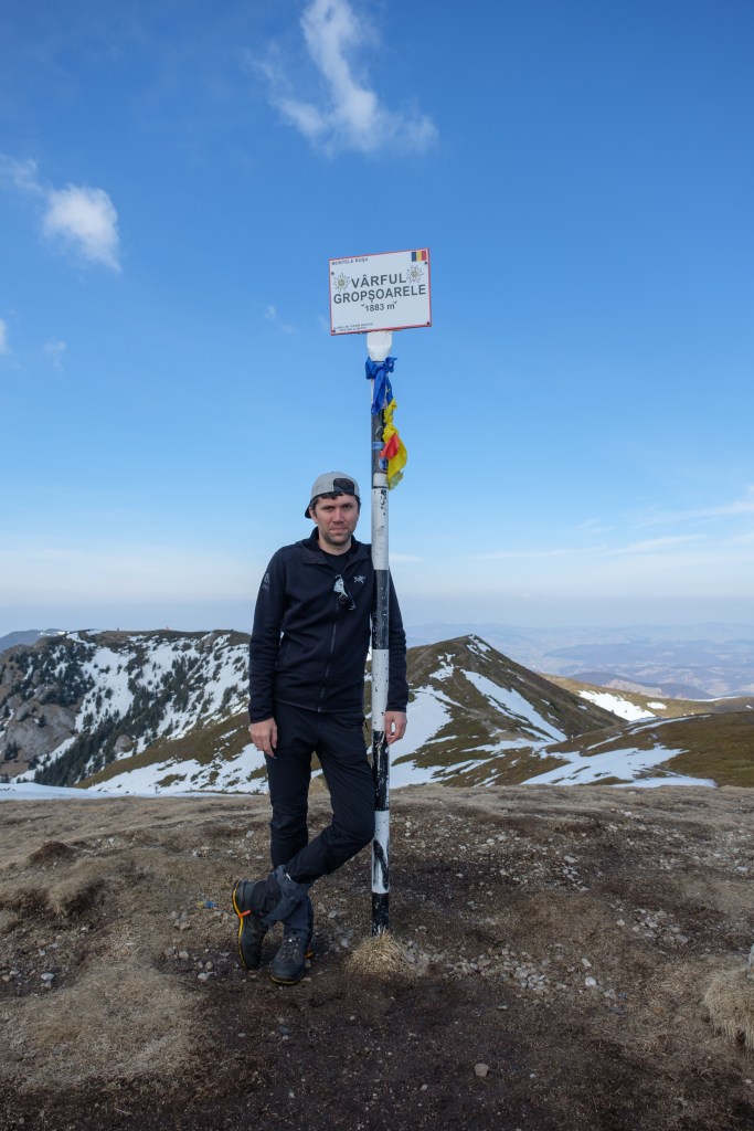 Varful Gropsoare ne primeste cu o vedere panoramica: se vad majoritatea lanturilor muntoase mari in zona dar si cu o pofta de mancare pe cinste. Mancam fiecare ce are prin rucsac dupa care facem pozele obligatorii cu indicatorul, fara sa stam la coada ca intr-o zi de weekend. De fapt nu ne-am intalnit cu nimeni pana aici si probabil ca pana la cabana nu vom vedea alti drumeti.