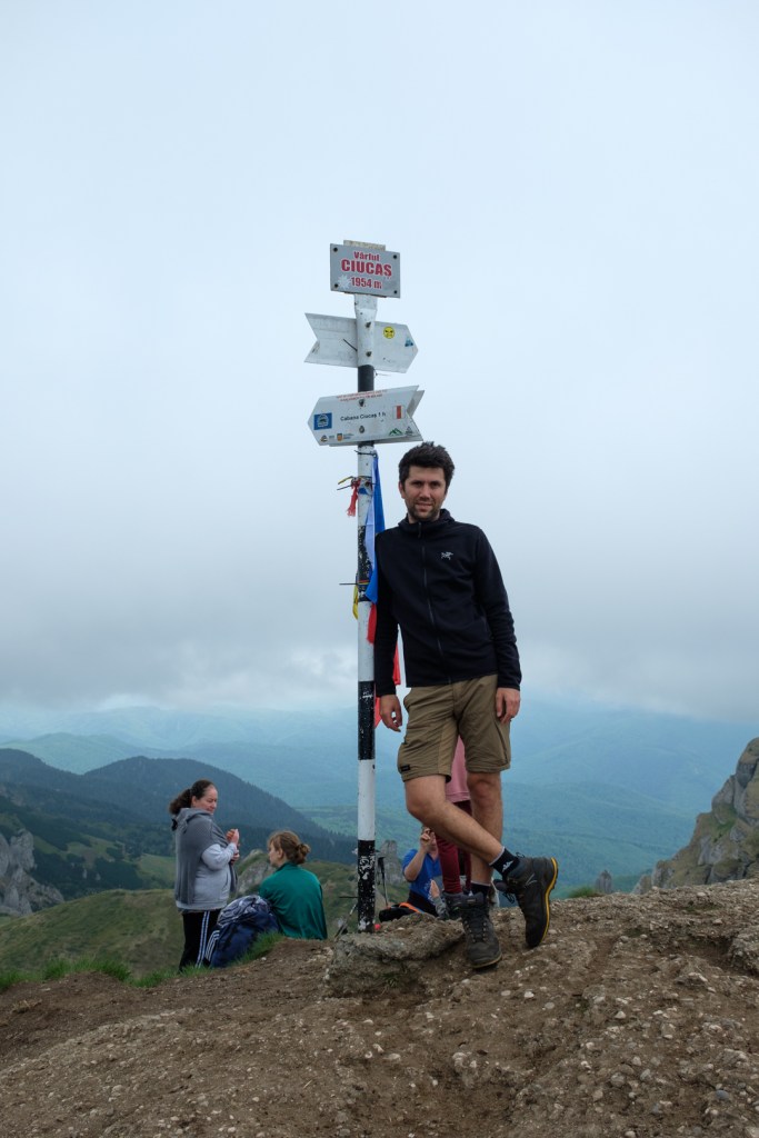 Ajunsi pe varful Ciucas (1954m) ne asezam la coada pentru poza obligatorie cu indicatorul si facem stanga pe creasta pentru a gasi un loc linistit de luat masa. Am gasit chiar si niste limbi de zapada troienita inca netopite.