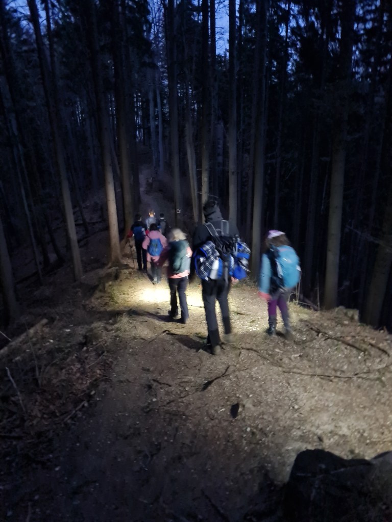 Facem cale întoarsă pe același drum familiar până la intersecția cu poteca țiganilor, marcată cu bulină albastră urmată de bulină roșie. Optăm să coborâm pe această potecă marcată, pentru a face un circuit, traseul terminându-se tot la Dâmbul Morii. Pentru că orele erau deja înaintate, ajungem să mergem ultima jumătate de oră la lumina frontalei.