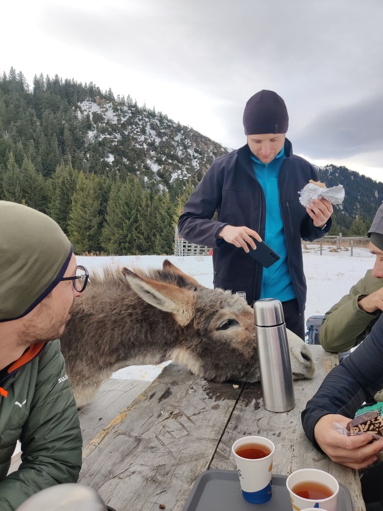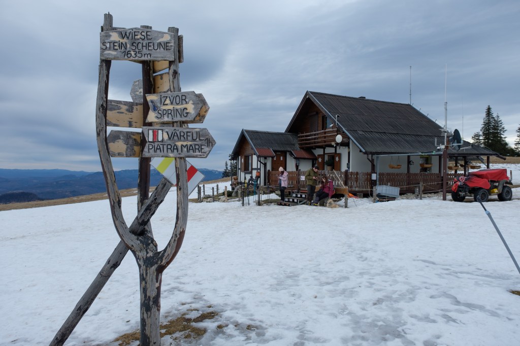 La cabana Piatra Mare suntem întâmpinați de 3 măgari folosiți de personalul cabanei să transporte marfă/alimente din oraș sus pe munte. Au și un ATV, dar pentru lucruri mai grele sau voluminoase folosesc măgarii, mai ecologici, 4×4 și nu se strică. Încercăm să mâncăm câte ceva dar suntem în continuu întrerupți de măgarii ce atentează la merindele noastre, mai răi ca niște câini pofticioși.