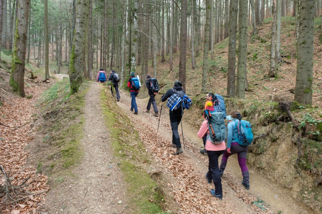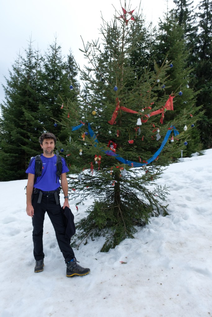 Drumul familiar este cel mai comun traseu pentru urcat în Piatra Mare. Dintre traseele disponibile din zona Dâmbul Morii, este cel mai domol, traseul fiind mai lung, dar cu pantă mai lină. Până la cabana, indicatorul anunță 2h45m, timp pe care îl facem și noi, un grup de 8 persoane, cu tot cu pauze și poze. Suntem mirați de lipsa zăpezii pe care o găsim mai sus de 1300m altitudine, începând cu Poiana Baciului. Tot aici este și „celebrul” brad natural împodobit cu globuri tot timpul anului.