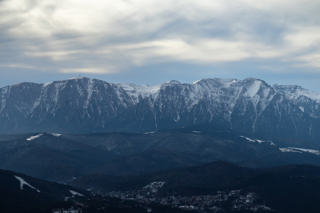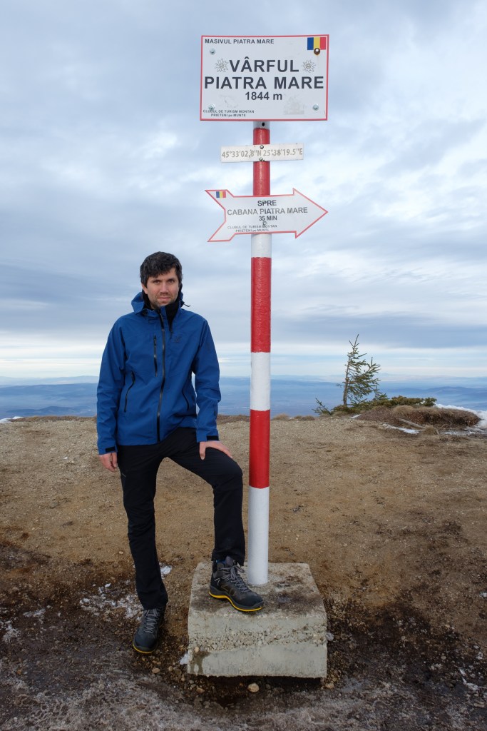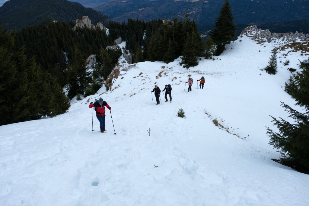Ajunși în creastă, suntem întâmpinați de un vânticel tăios, care ne face să ne punem niște geci de vânt, dar și de o priveliște de poveste asupra Bucegilor. Facem poză cu vârful Piatra Mare și începem să coborâm înapoi spre cabană, cu mini colțarii în picioare, pentru a nu fi surprinși de eventuala gheață.