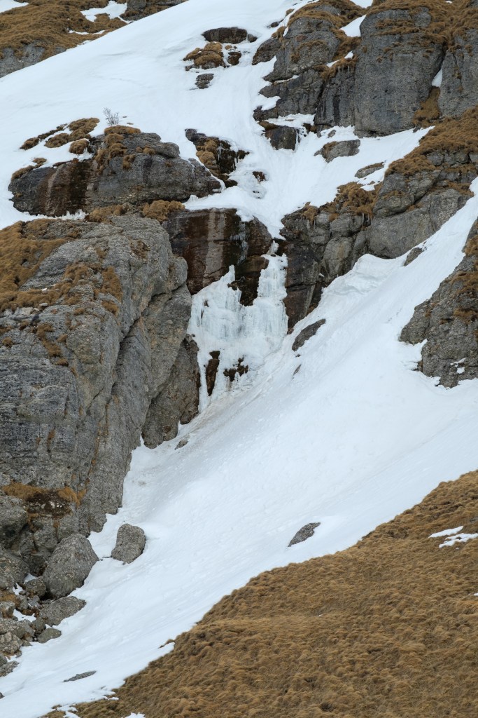 Până la cascada Ialomitei poteca a alternat între iarbă și zăpadă iar cascada era încă înghețată. În depărtare se mai vedeau niște țurțuri atârnând de niște stânci, probabil din zăpadă topită cu o zi înainte. Sus pe Culmea Doamnele, în stânga văii, se vedeau încă coarnișe.