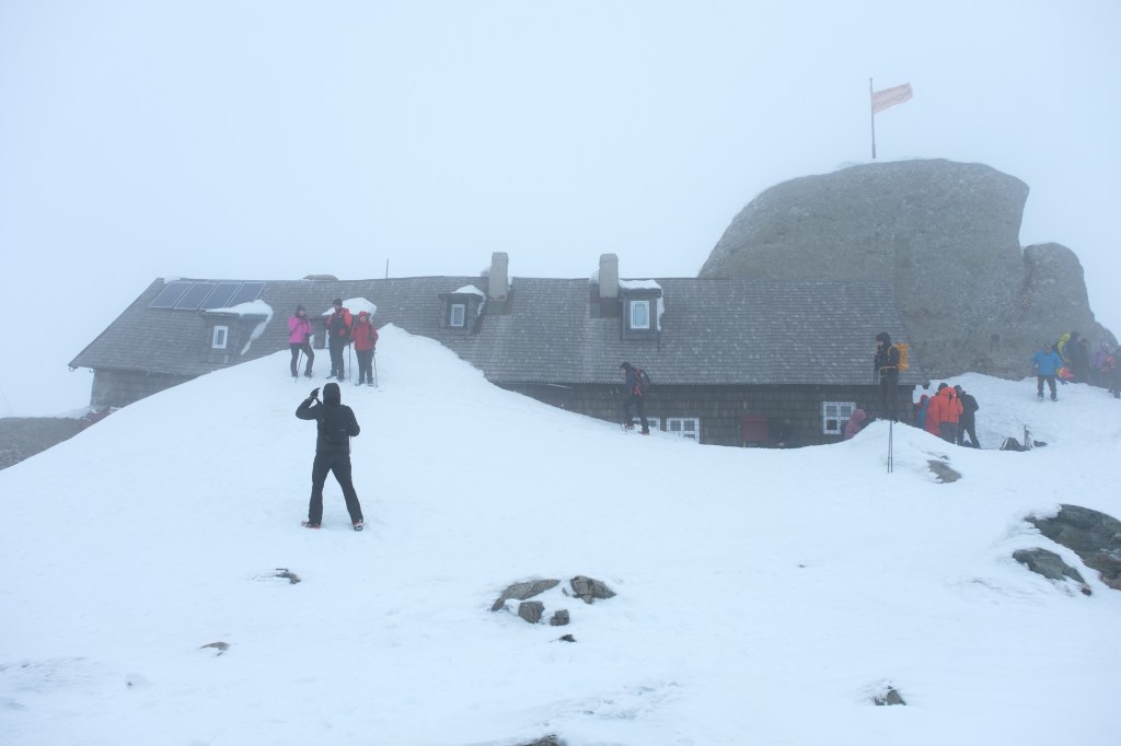 La cabana Vf. Omu ne întâlnim cu alți turiști, gălăgioși, care se pozau de zor cu cabana sau cu stânca din spate. Ne așteptăm rândul să facem și noi poze și ne bucurăm că nu ne ia vântul de pe picioare, așa cum anunță meteoblue. Nici de geacă de puf nu a fost nevoie, o bluză de lână, un polar și o geacă hard shell au fost suficiente, senzorul de Garmin arătând 0 grd, cea mai scăzută temperatură de pe traseu. Cabana nu e chiar în gol în zăpadă, însă era un troian mare pe care te puteai urca până pe acoperiș.