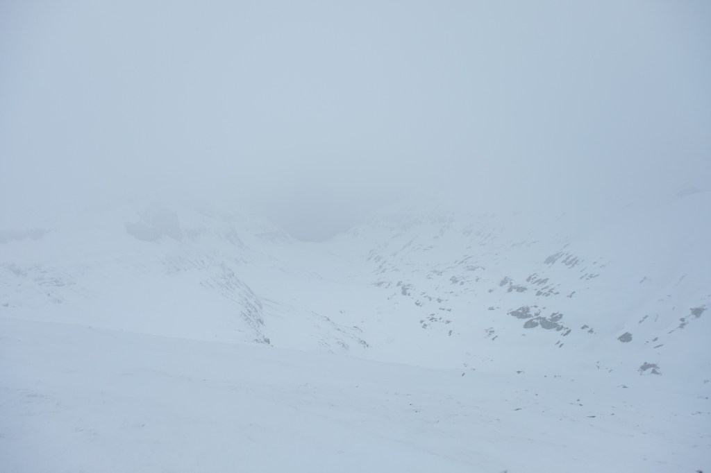 Pe măsură ce trece timpul, vizibilitatea a devenit tot mai redusă iar la întoarcere, pe lângă vârful Bucura Dumbravă era total whiteout. Ne-am ţinut după urmele formate deja pe zăpadă și am ajuns cu bine la începutul văii Ialomiței, unde s-a și luminat, coborând sub plafonul de nori.